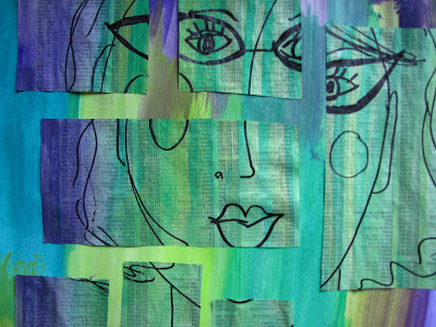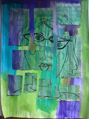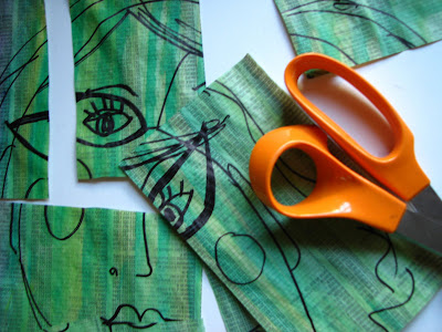 Once their large sheet of paper is dry, get out the gluestick and have your kidlet re-assemble their portraits so that there is space between each shape. They can of course mix up their features so that the mouth is on top, etc. It's like a portrait puzzle game. Have fun with it! Once they have their portrait pieces arrange to their liking, back each shape with glue from the gluestick, press and smooth out any creases.