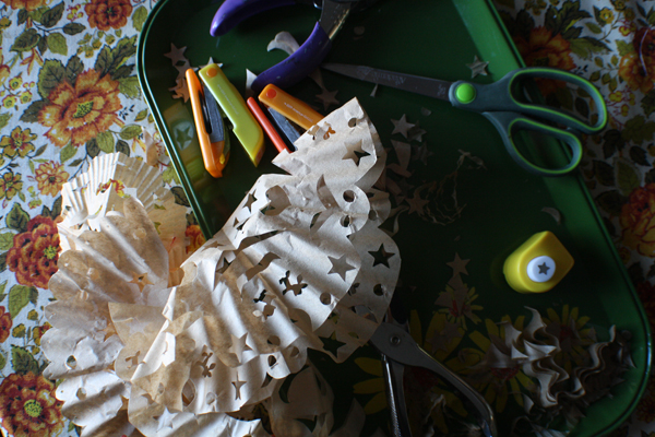 Once the tissue tree has been completed, give your button/earring/pin a healthy does of tacky glue and glue to the top for the tree's star.