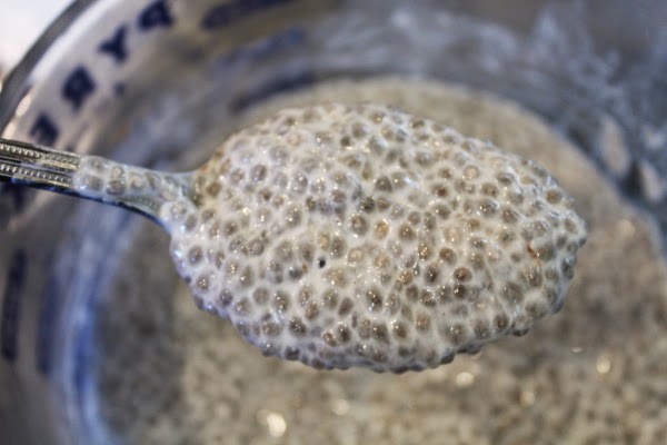 Pour your coconut milk into a medium sized bowl (I used a 4 cup measuring cup) and add your half n half. Next dump your chia seeds into the milk and add your honey as well. Use a wooden spoon to mix it up and add your vanilla. I also added a dash of cinnamon...I was feeling whimsical. Mix it all up and pop it into your refrigerator. If you think of it, after an hour or so, pull out the mixture and give it another stir or two. The seeds tend to settle on the bottom.