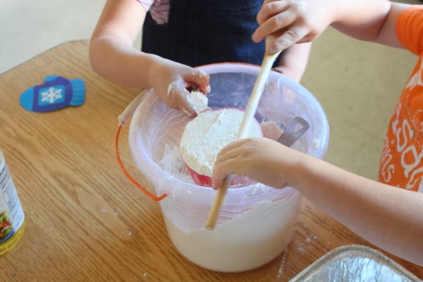 This batch here was for a week of faux snow play and so while it did not have any color added, it did need a glitter boost. Everyone loves a turn shaking glitter into the mix.