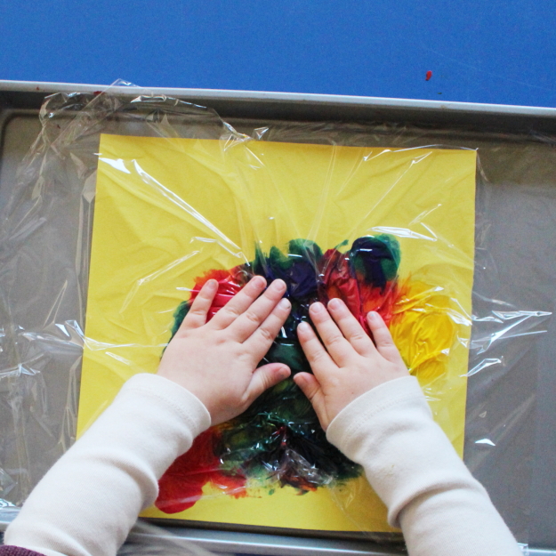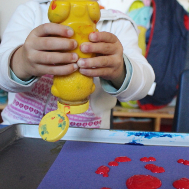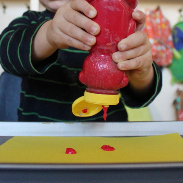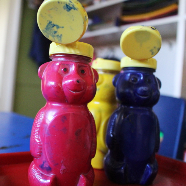 I am loving our new kitchen/large art area set up! We used to have a series of tables that were too tall for the kiddos to sit at. They could sit but their feet would dangle and they would grow super wiggly. I firmly believe that having their feet on the ground keeps them focused and grounded so the old big blue table that used to hold fine motor activities was moved into the kitchen! It poses its own issues (our chairs seats hit too high) but so far it is working nicely. I want to cover it with a solid oilcloth or maybe a woodgrain...anything to mask that blue! My dream is to get wooden chairs. Someday!