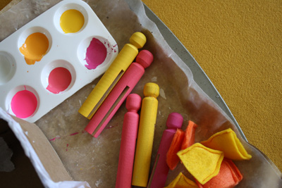Have your kidlets paint up each clothespin in the manner that they choose. Go with all one color across the board or have your tots mix up their own colors. You can start with one color and add a little white each go to further tint up the color or add a little black to shade em out. It's all up to you and your young ones.