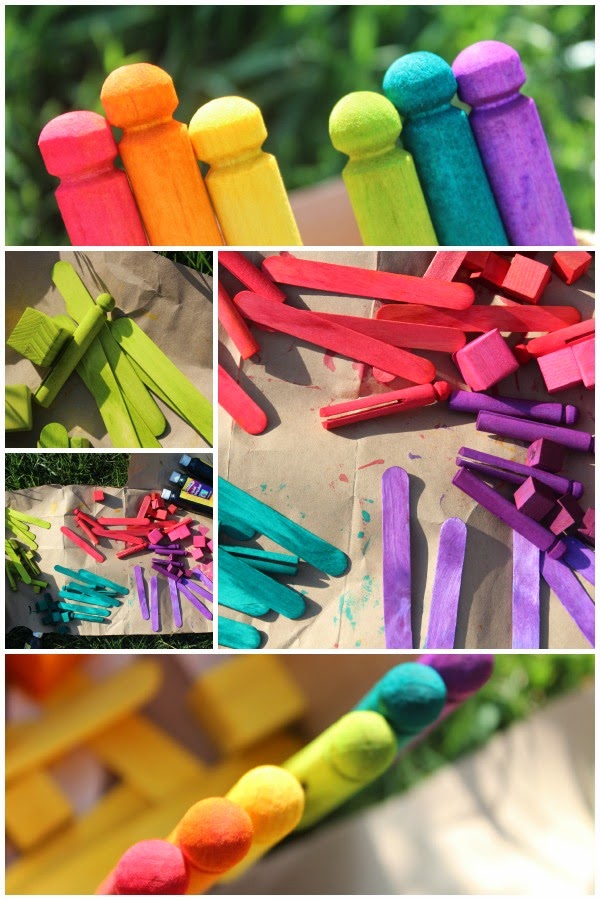 While I was at it, I dyed large craft sticks and small wooden cubes as well. These are not colorfast and do bleed onto paper and play dough when wet (maybe they would be colorfast if I had added rubbing alcohol). But that's okay, I think that only adds to their charm.