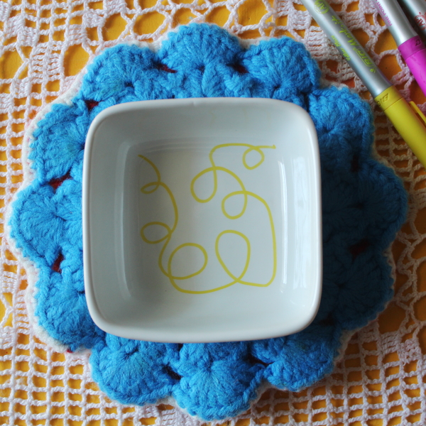 Place your dish onto a marker friendly surface. This dish here was picked up at Target for $1.99 but you can find similar pieces at your local thrifts, box stores, or maybe even the dollar store.