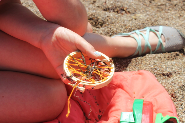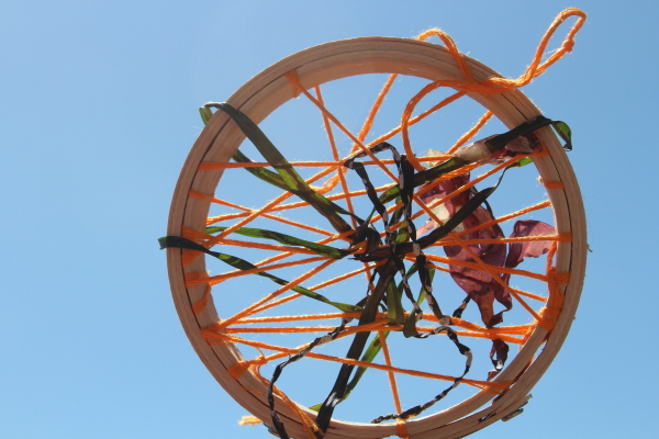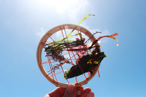 The more wrapping and webbiness you add to your hoop, the more non-linear items can be added. You can weave long strands of seaweed in and out of the crossing threads or you can poke and coax smaller pieces of wavy seaweed and pebbles in between the threads.